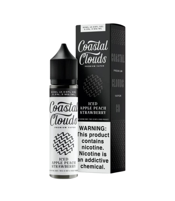 Coastal Clouds Iced Apple Peach Strawberry, elma, şeftali ve çilek aromalarını ferah “ice” dokunuşuyla sunan 60 ml’lik freebase e-likittir. 70 VG / 30 PG oranı ile serin ve meyvemsi bir içim deneyimi sağlar.