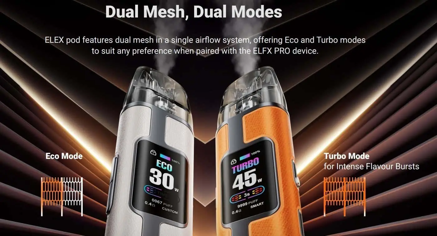 • Dual mesh coil pod seçenekleri: 0.6 Ohm ve 0.8 Ohm — yoğun aroma ve düzgün buhar