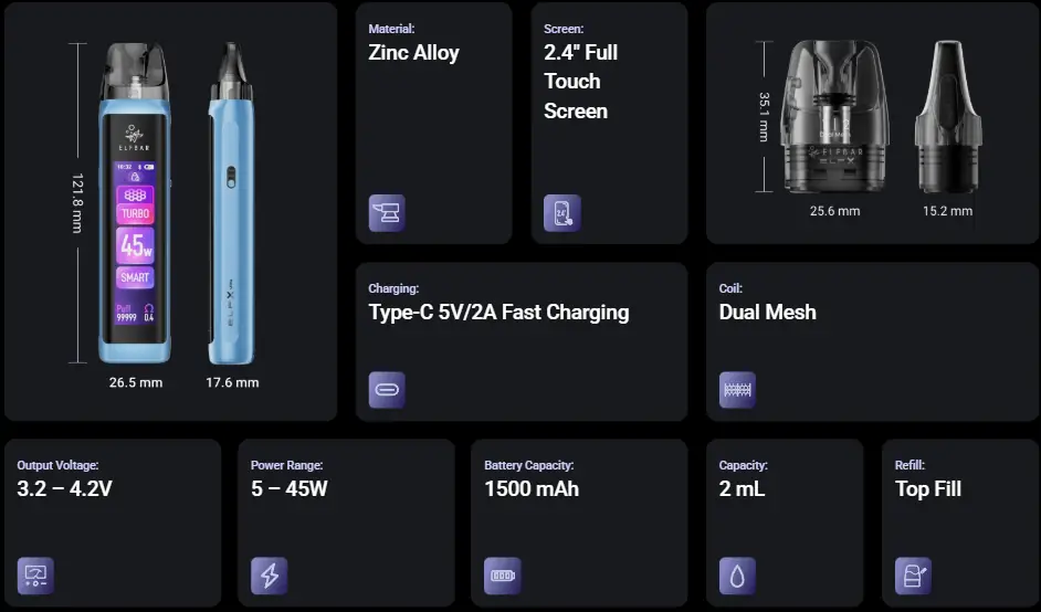 Elf Bar ELFX Ultra, akıllı kontroller, özelleştirilebilir tema seçenekleri ve yüksek teknolojili özellikleriyle öne çıkan bir pod vape cihazıdır. 2.4″ tam dokunmatik ekranı, akıllı RGB ışık efektleri, Turbo ve Eco modları ile kullanıcıya istediği performansı sunar. Dahili 1500mAh bataryasıyla tek şarjda birkaç günlük kullanım sağlar; USB-C 5V/2A ile hızlı şarj imkânı vardır. Infinite Airflow sistemi sayesinde MTL’den DTL’e kadar hava akışı ayarı yapılabilmektedir.