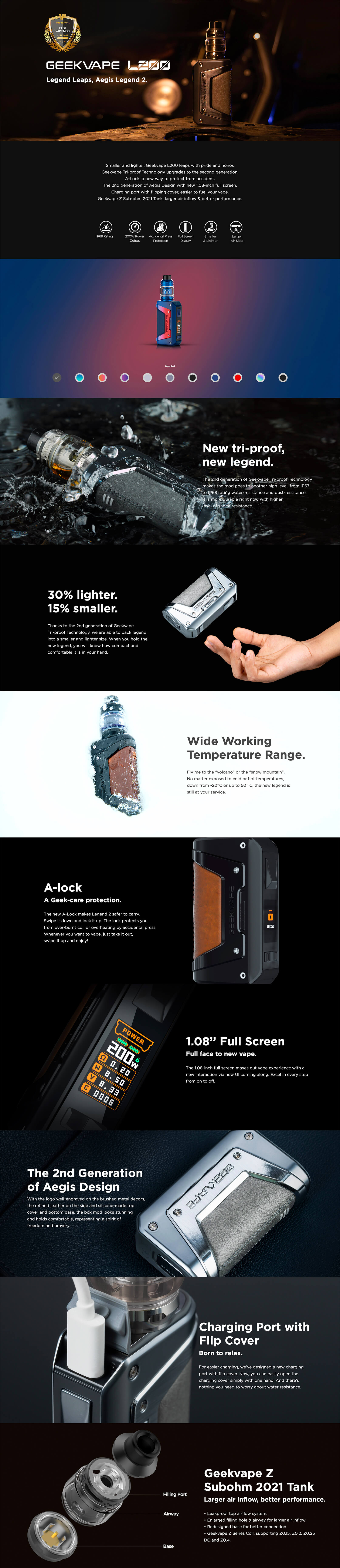 Geekvape L200 (Aegis Legend 2) Kit200W’a kadar çıkış gücü sunan çift 18650 pil ile çalışan, dayanıklılığı ile tanınan Aegis Tri-proof Teknolojisinin geliştirilmiş bir versiyonudur.