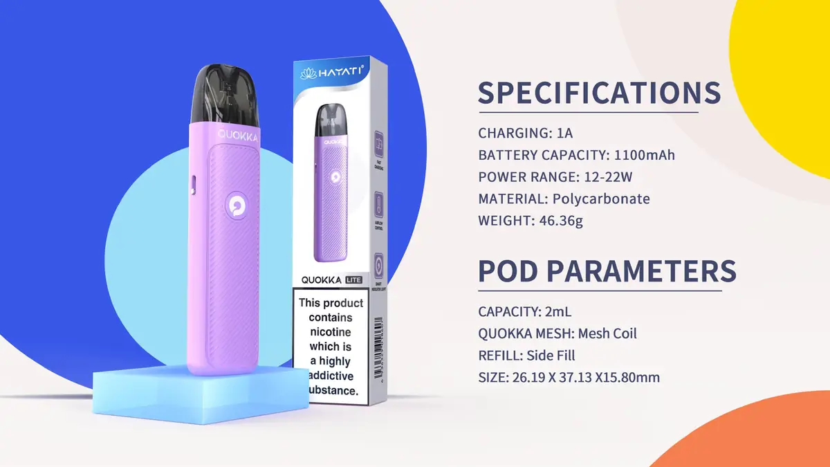 Hayati Quokka Lite Pod Vape Kit, 1100mAh bataryası, 12-22W çıkış gücü ve 0.6 / 0.8 / 1.2 Ohm mesh pod seçenekleri ile aroma ve buhar dengesini yakalayan bir cihazdır. RGB ışık göstergesi, Type-C hızlı şarj ve ayarlanabilir hava akışı sayesinde MTL ve RDL içim tarzlarını destekler. Hafif ve renkli gövdesiyle hem kullanım kolaylığı hem stil sunar.