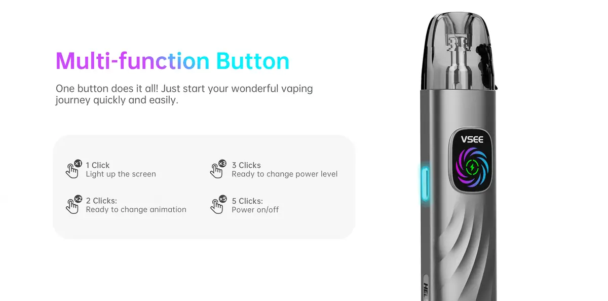 Hellvape VSEE One, kompakt boyutu ve güçlü işlevselliğiyle öne çıkan, her seviyedeki kullanıcı için uygun bir pod sistem kitidir. 1000mAh dahili bataryası ve 30W’a kadar çıkabilen maksimum gücü ile hem uzun süreli kullanım sağlar hem yeterli buhar ve aroma üretir. 4 farklı güç seviyesi, ayarlanabilir hava akışı ve renkli dinamik ekranıyla cihaz kullanım keyfini artırır.