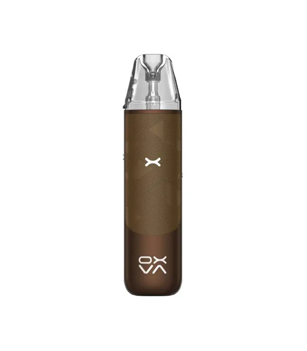 OXVA NeXlim Pod Mod siyah ve kahverengi deri kaplamalı, dijital ekranlı elektronik sigara.