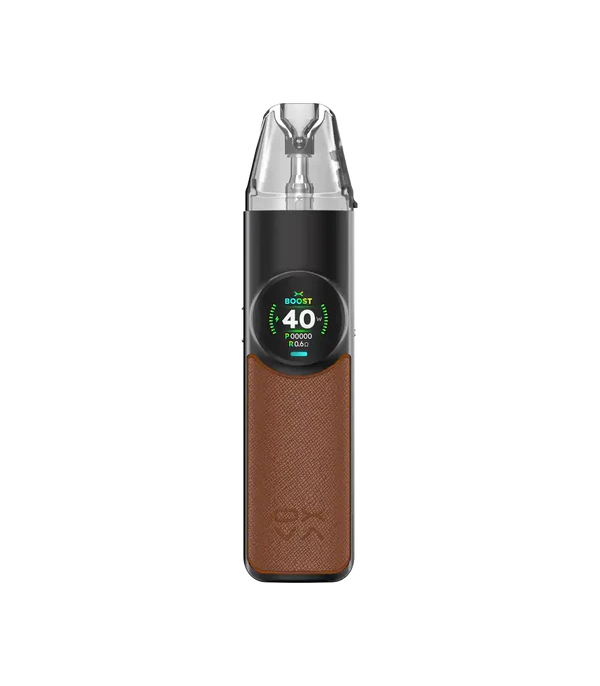 OXVA NeXlim Pod Mod siyah ve kahverengi deri kaplamalı, dijital ekranlı elektronik sigara.