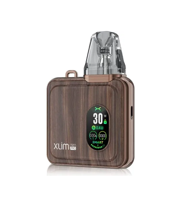 OXVA Xlim SQ Pro Pod Mod kahverengi ahşap görünümlü, dijital ekranlı.
