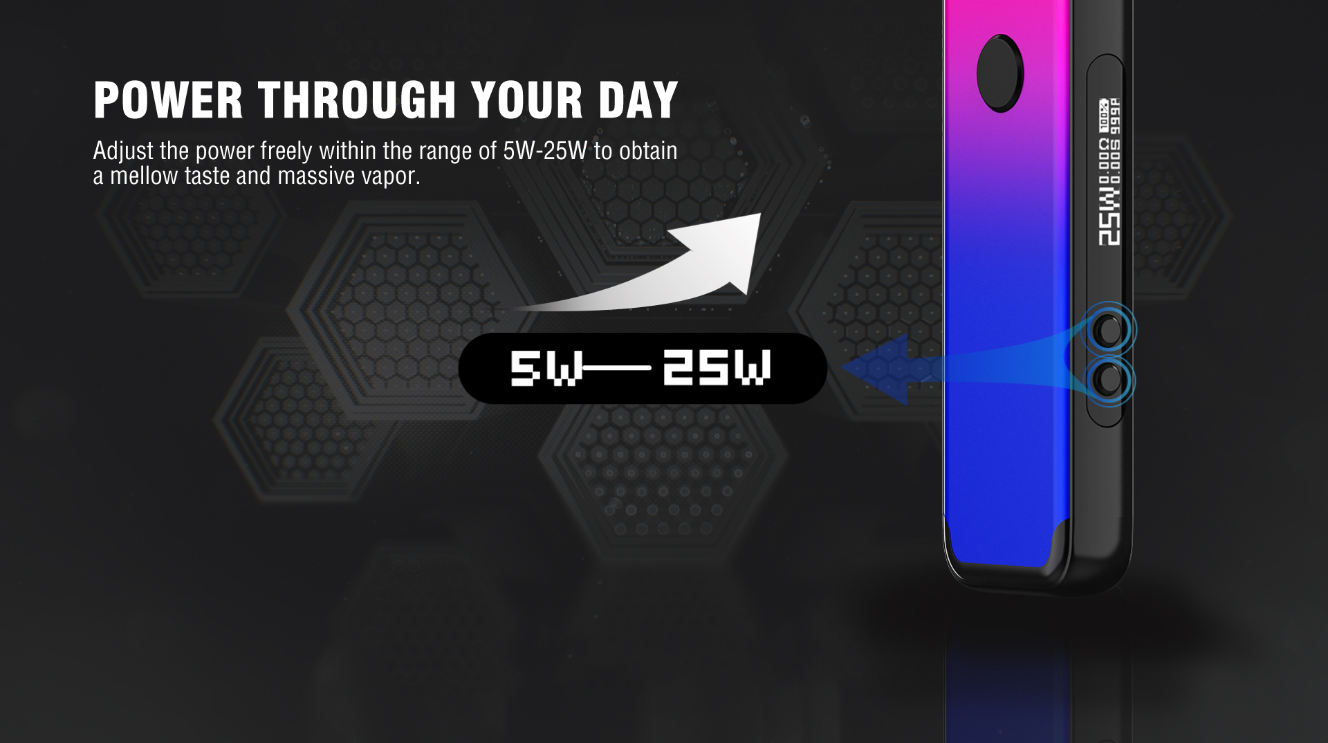 SMOK Nfix-mate Pod Mod, dahili 1000 mAh bataryası sayesinde 1-25 watt arasında ayarlanabilir çıkış gücüne sahiptir.