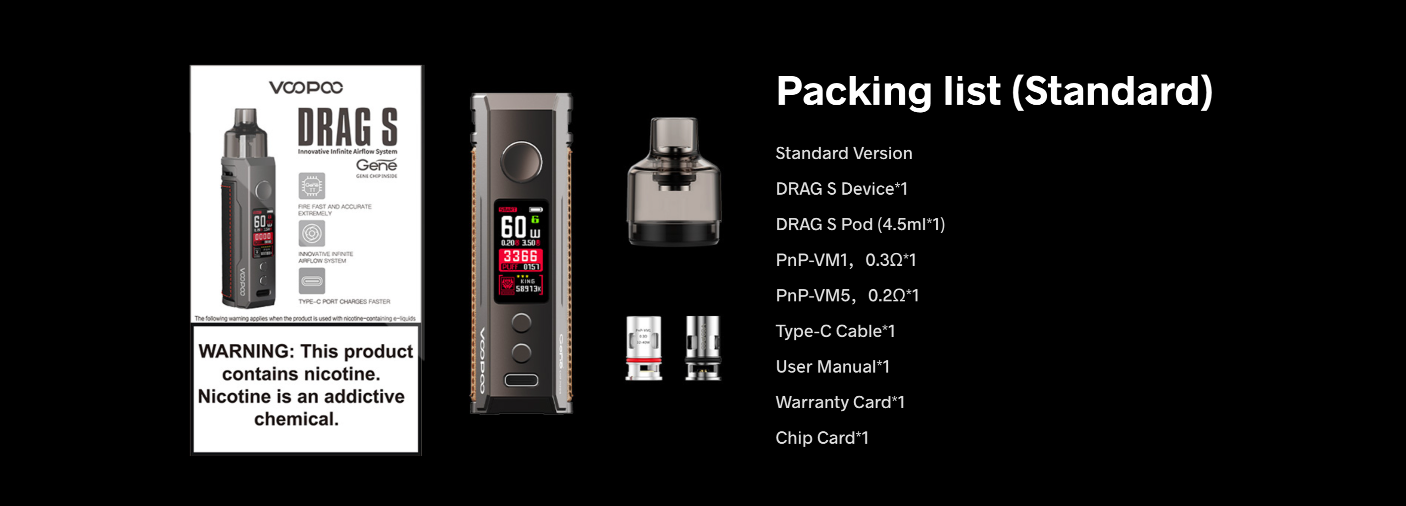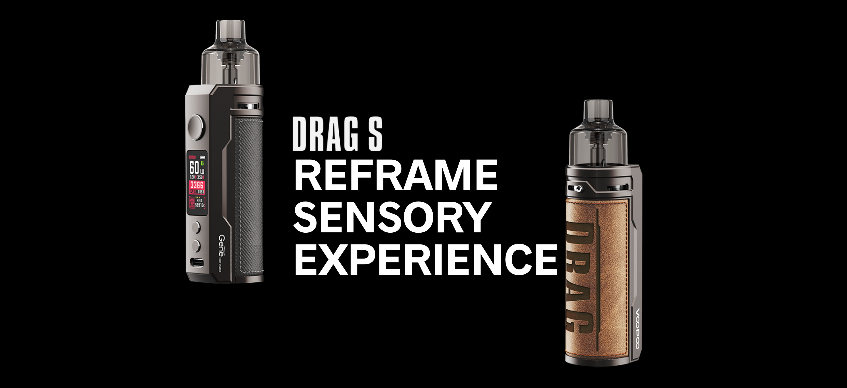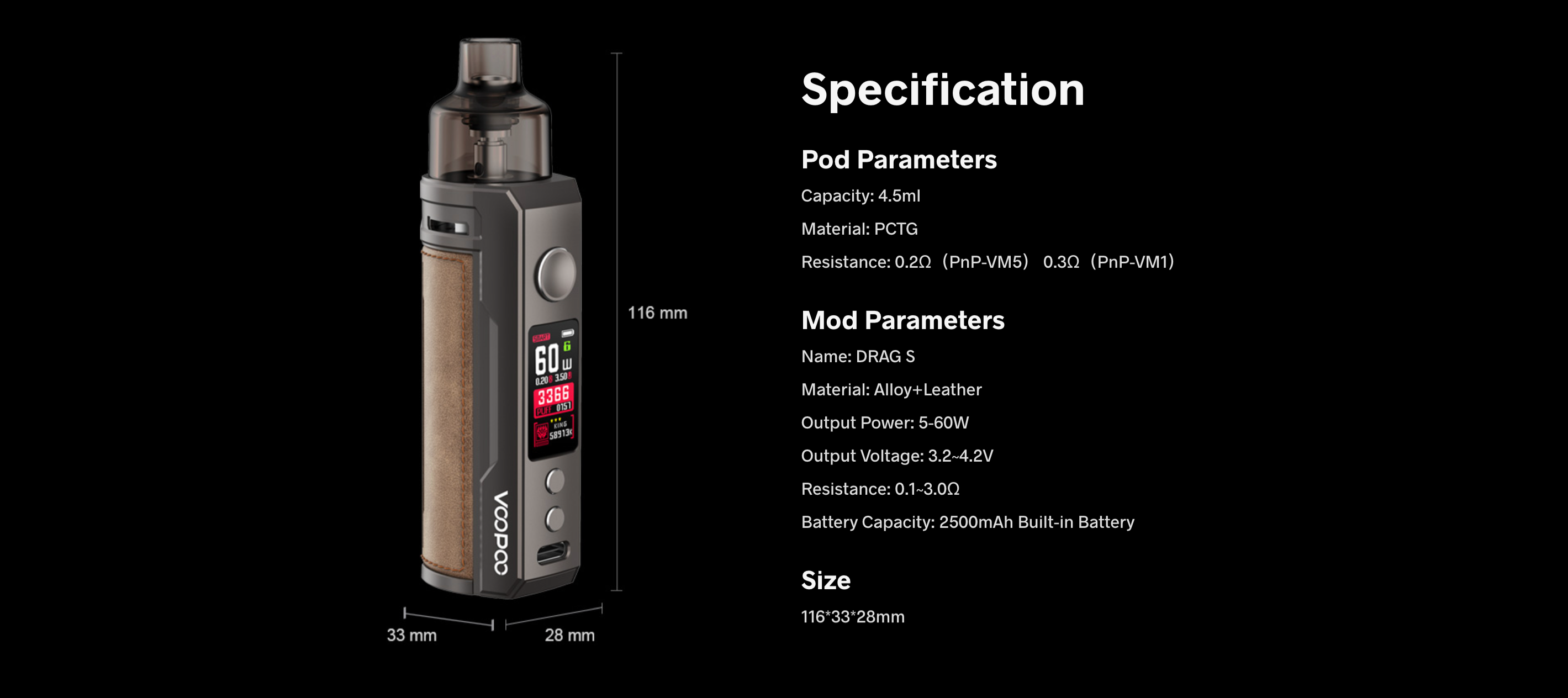 Voopoo Drag S Pod Mod60W’a kadar güç çıkışı sağlar. Ayrıca, deri ve metalin kusursuz birleşimi sayesinde hem dayanıklı hem de şık bir görünüm kazanmıştır.