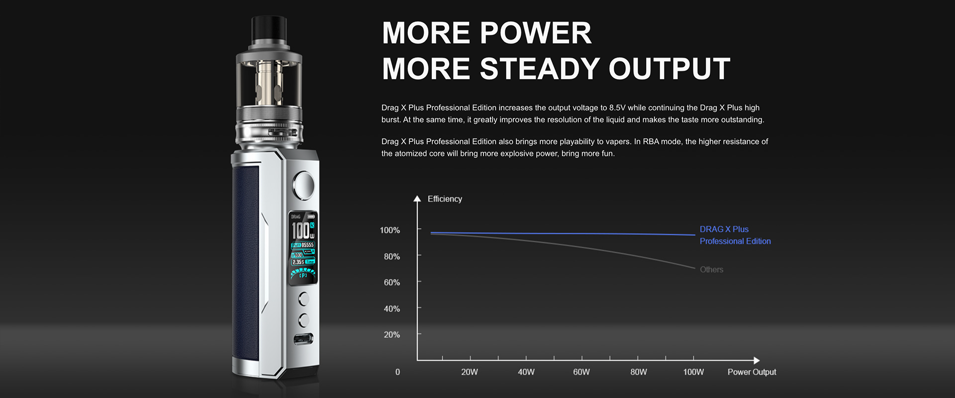 Voopoo Drag X Plus Pro, deri ve metalin klasik tasarımını sürdüren şık bir pod mod olup, GENE.FAN 2.0 çipi ile maksimum 100W çıkış gücü sunar.