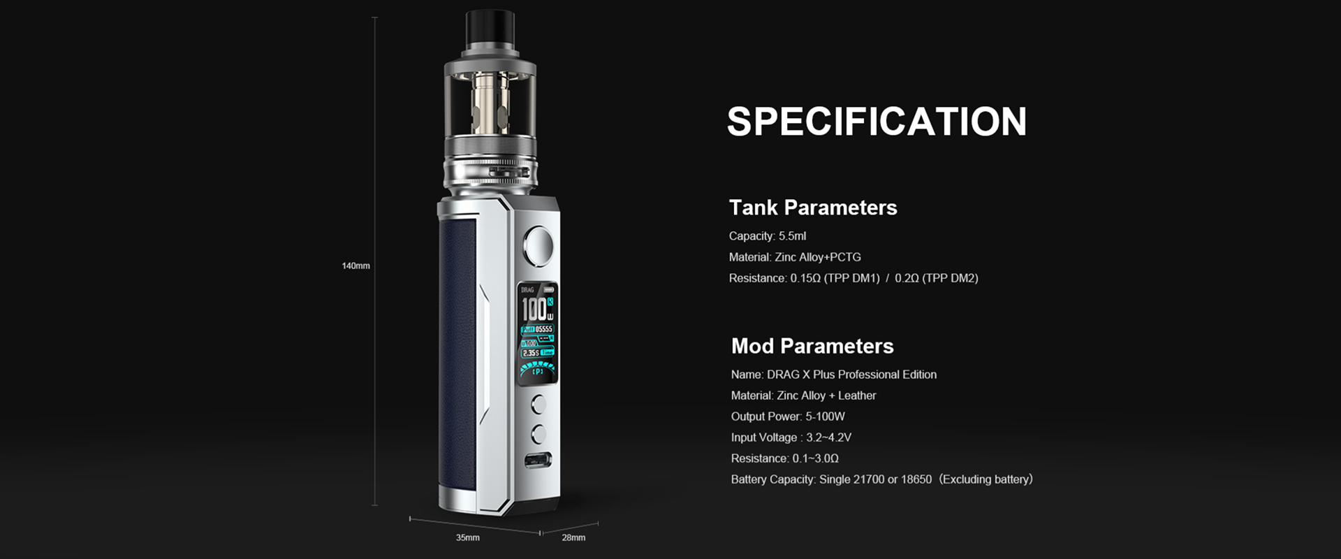 Voopoo Drag X Plus Pro, deri ve metalin klasik tasarımını sürdüren şık bir pod mod olup, GENE.FAN 2.0 çipi ile maksimum 100W çıkış gücü sunar. 21700 ve 18650 pillerle uyumlu olarak çalışabilen bu cihaz, 510 arayüzlü yeni TPP Pod Tankı ile daha fazla esneklik ve kişiselleştirme imkanı sağlar.