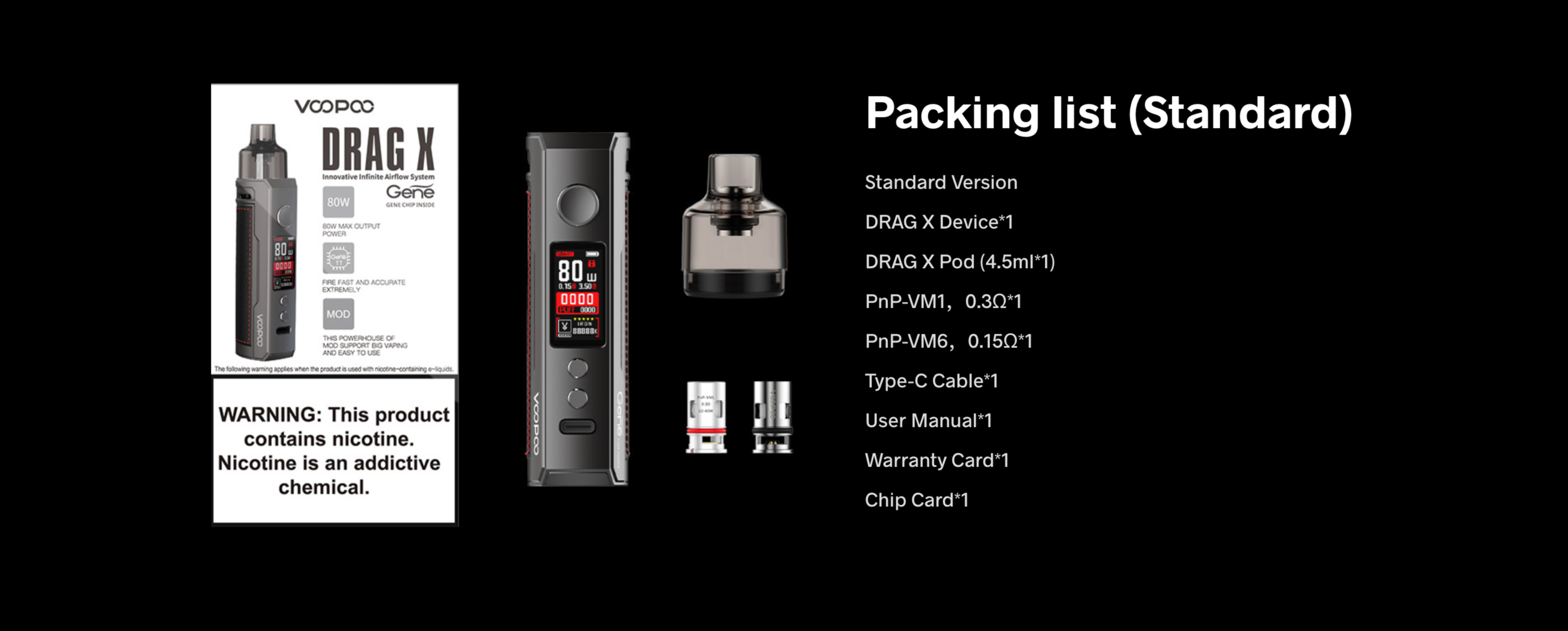 Voopoo Drag X Pod Mod bir adet 18650 harici pil ile çalışmaktadır. Tip-C ile güç kaygısından uzak hızlı şarj olma özelliğine sahiptir. 5W ile 80W arası ayarlanabilir güç modu 0.001s aşırı ateşleme sağlayan yeni nesil GENE.TT çip seti ile donatılmıştır. Kartuşu 4.5ml’lik büyük bir likit kapasitesi ve yenilikçi hava akış sistemiyle üretilmiştir.