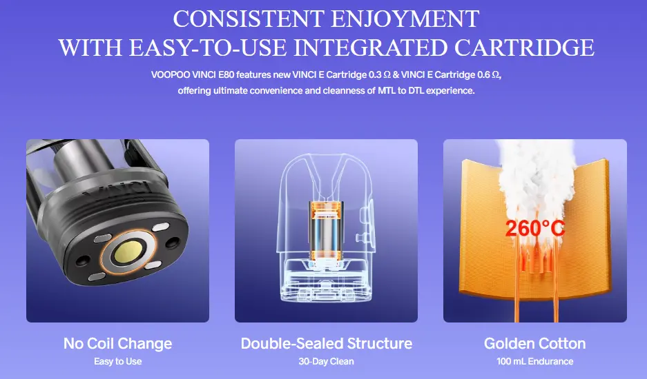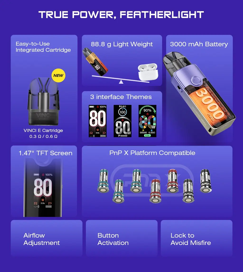 Vinci E120, Voopoo'nun yenilikçi tasarım anlayışını ve teknolojik birikimini yansıtan, kullanıcıların beklentilerini karşılayan bir pod mod.